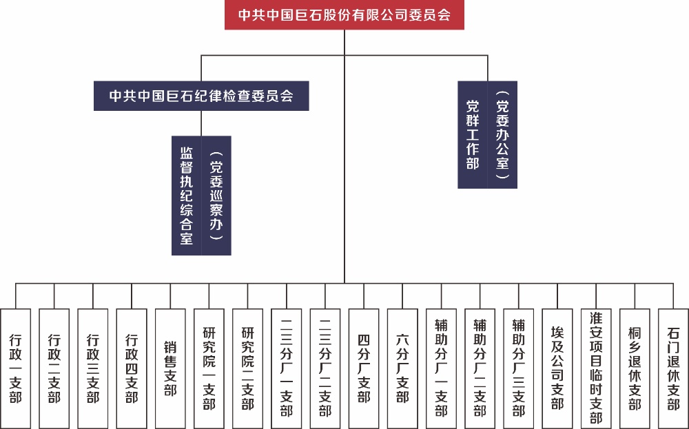 中共巨石集團(tuán)委員會成立于1996年4月,2015年12月更名為中共中國巨石委員會。公司黨委領(lǐng)導(dǎo)班子健全,總裁楊國明擔(dān)任黨委書記,黨委副書記:邵曉陽,黨委委員:曹國榮、丁成車。黨委下設(shè)19個黨支部,各設(shè)有支部書記、組織委員、宣傳委員、紀(jì)檢委員等。現(xiàn)有黨員630人,其中正式黨員620人,預(yù)備黨員10人。中層及以上干部黨員人數(shù)為328人,女黨員103人。碩士以上學(xué)歷57人,其中博士6人。
